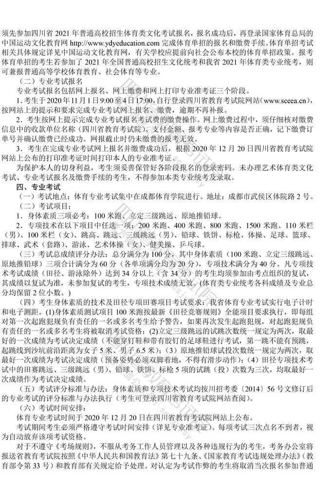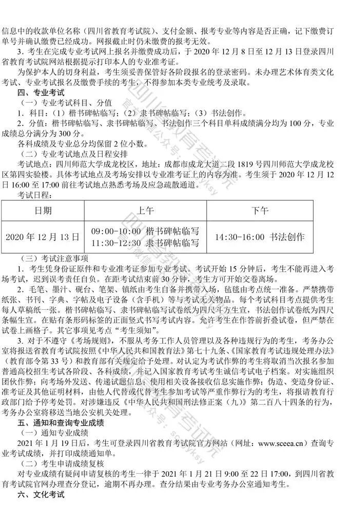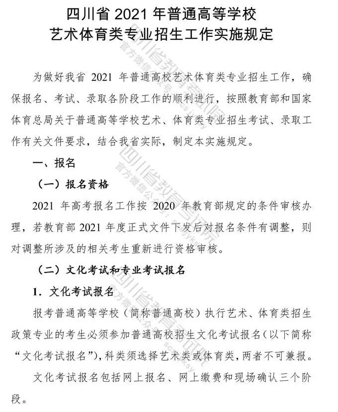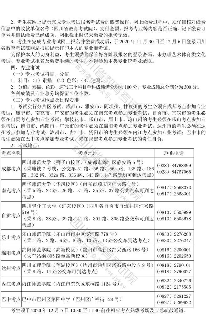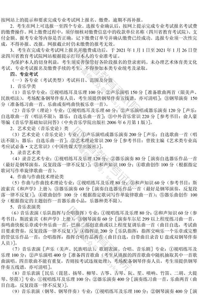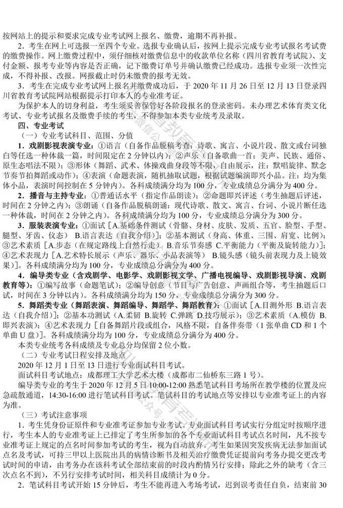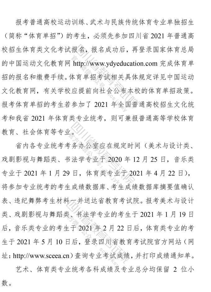 报考艺术、体育类专业的考生在完成文化考试报名后,还需进行专业考试网上报名和缴费,各类专业统考网上报名、缴费的时间安排在2020年11月1日至4日,具体办法详见《四川省2021年普通高等学校艺术体育类专业招生工作实施规定》。
