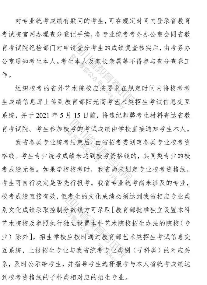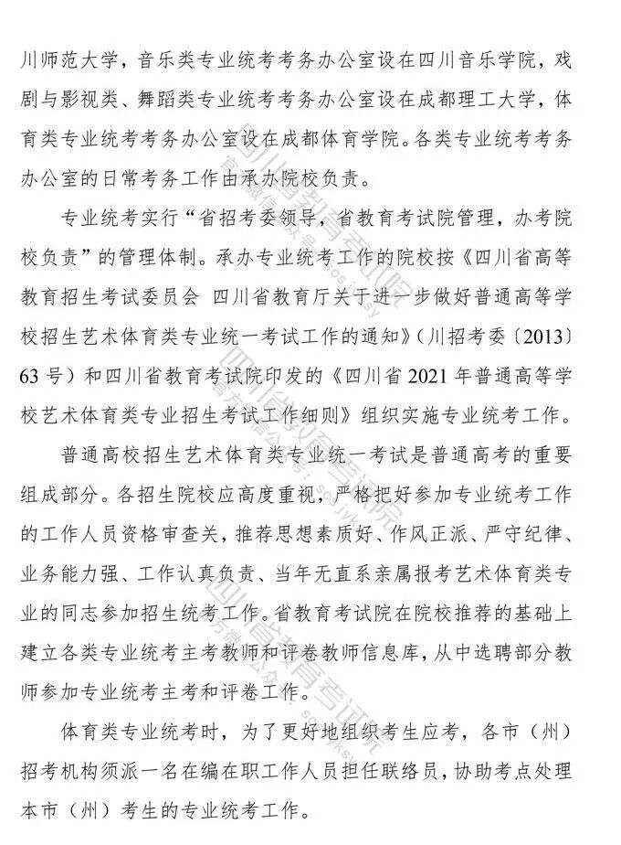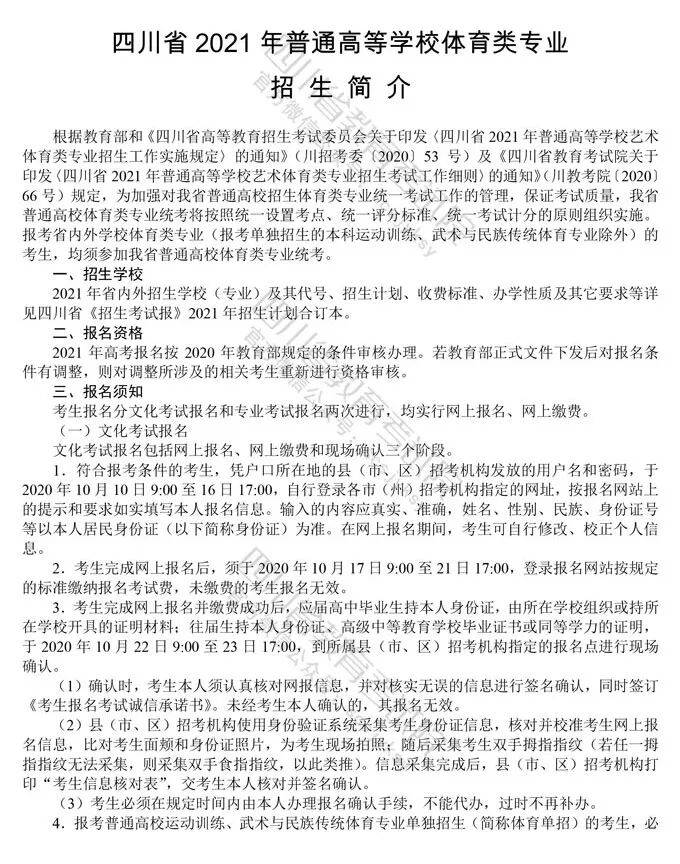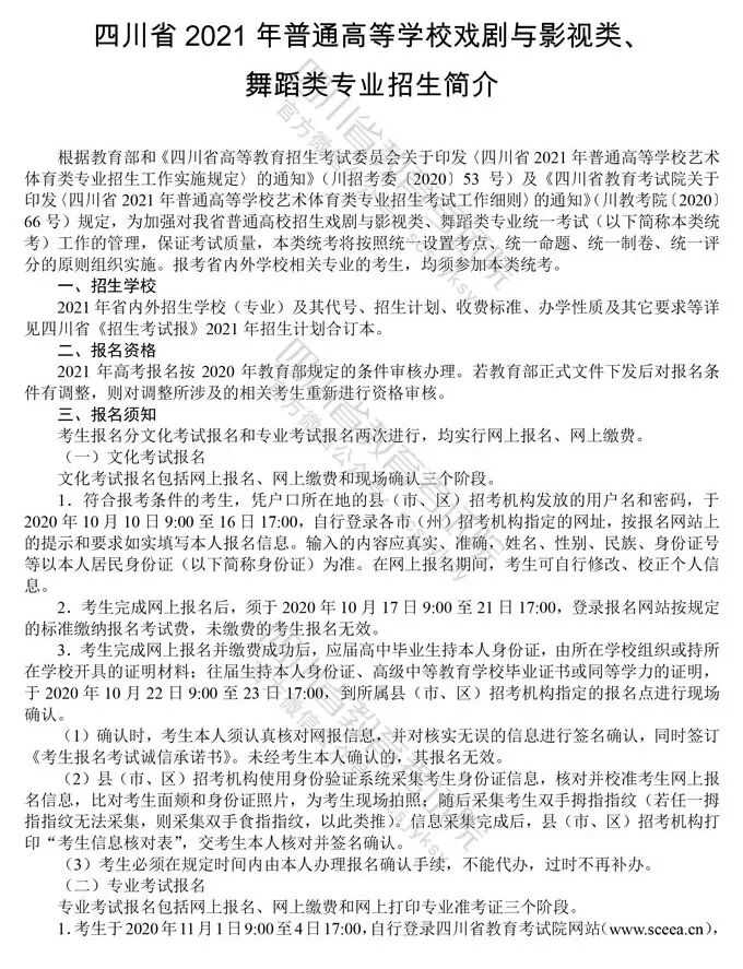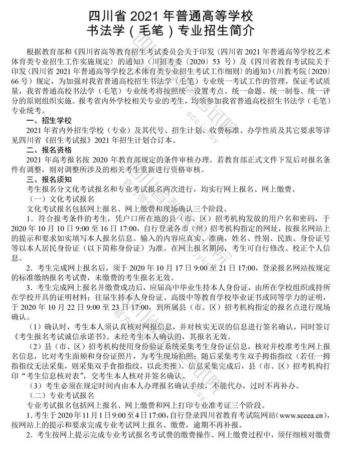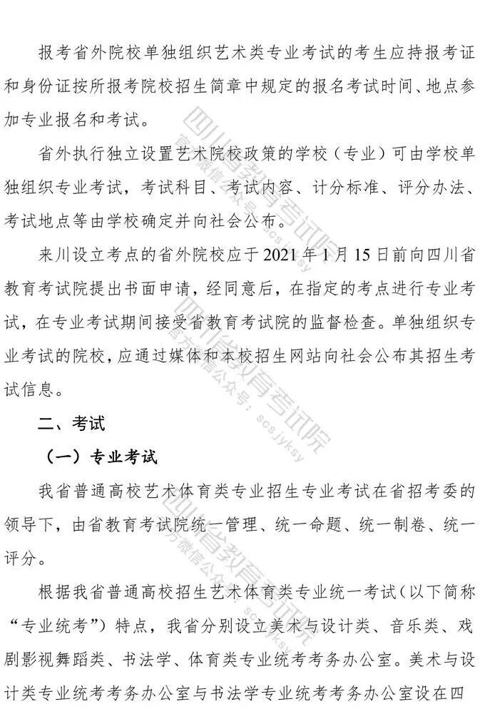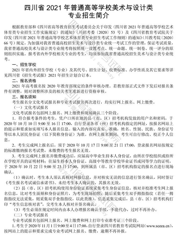报考艺术、体育类专业的考生在完成文化考试报名后,还需进行专业考试网上报名和缴费,各类专业统考网上报名、缴费的时间安排在2020年11月1日至4日,具体办法详见《四川省2021年普通高等学校艺术体育类专业招生工作实施规定》。