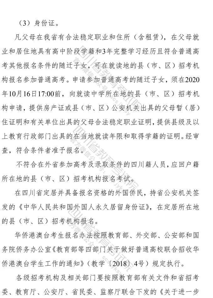3.凡父母在我省有合法稳定职业和住所(含租赁),在父母就业和居住地具有高中阶段学籍和3年完整学习经历且符合普通高考其他报名条件的随迁子女,可在就读地县(市、区)招考机构报名参加普通高考。申请参加普通高考的随迁子女,应在2020年10月16日前,向就读中学所在的县级招考机构申请,提供房产证或县级公安机关出具的父母暂(居)住证明和有关单位出具的父母合法稳定职业证明,提供县级及以上教育行政部门出具的在当地就读年限和取得学籍的证明。经审核,符合条件者准予报名。